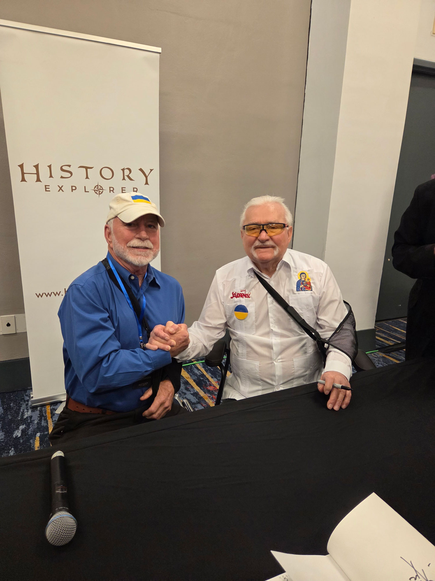 Honoring Lech Walesa and Volodymyr Zelenskyy. Sharing a heartfelt handshake of comradery, Richard R. Troxell, cofounder of House the Homeless, meets one of his lifetime heroes, electrical dockworker, past President of Poland, and Nobel Peace Prize recipient, Lech Walesa. It is clear that they share their mutual respect and love for the people, the yellow flag of Ukraine and their President Volodymyr Zelenskyy.